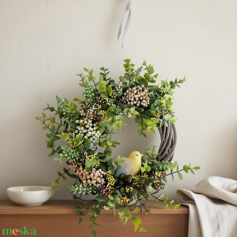 Bogyós tavaszi koszorú - kismadárral, természetes hatású ajtódísz