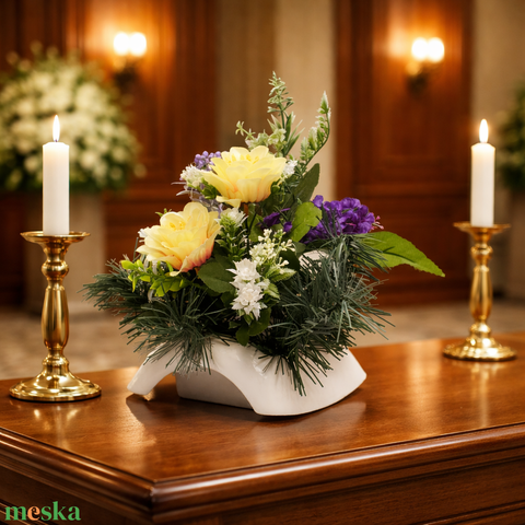 Tavaszi hangulatú temetői dísz sárga és lila virágokkal