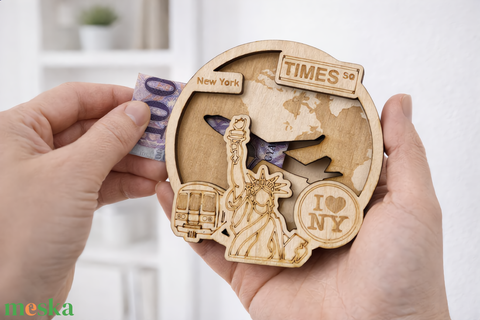 New York - Utazás tematikájú fa pénzajándék átadó - Pauze Money Gift