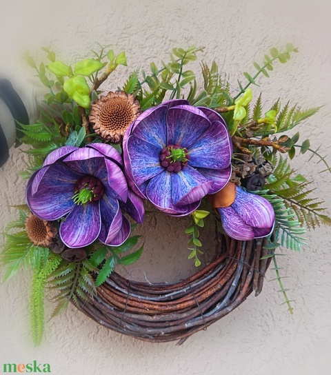- Anyag/Összetevő vessző koszorúalap, élethű magnólia, szárított virágok és termések