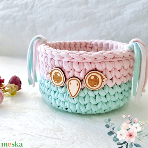 Horgolt bagoly tárolókosár egyedi felirattal. Ajándék gyerekeknek