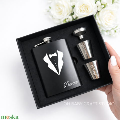 Tanú ajándék – vőlegény és tanú felkérő szett laposüveggel és felespoharakkal