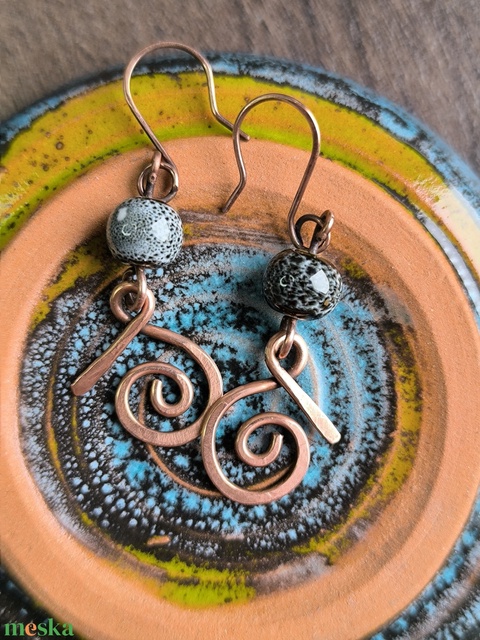 Vörösréz fülbevaló fekete kerámia gyönggyel