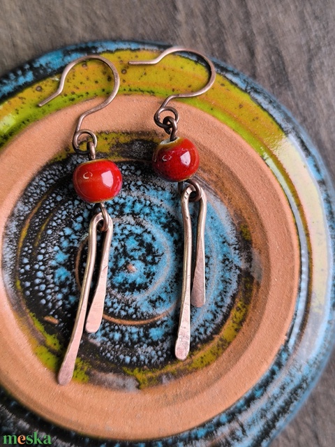 Vörösréz fülbevaló piros kerámia gyönggyel