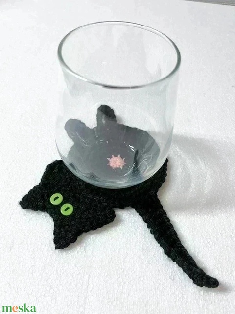 Horgolt cica poháralátét, 9–10 cm (teste). Aranyos, vicces ajándék macskakedvelőknek. Kézzel készült.