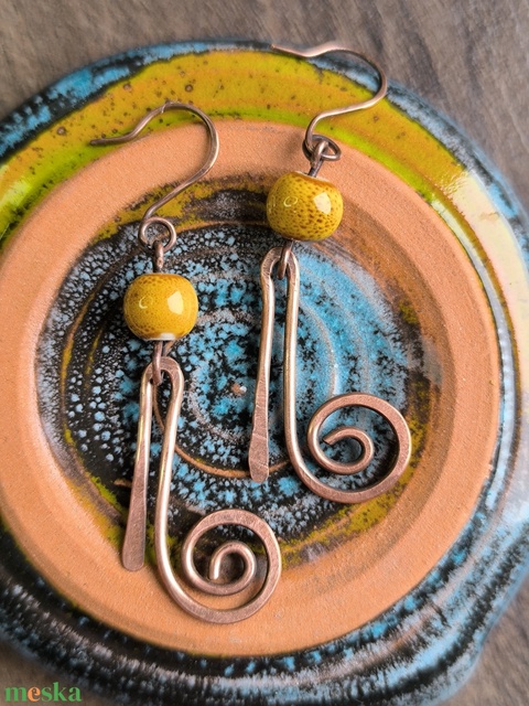 Vörösréz fülbevaló sárga kerámia gyönggyel