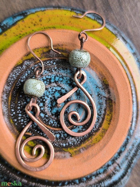 Vörösréz fülbevaló szürkéskék kerámia gyönggyel
