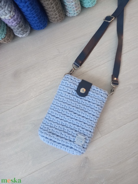 Világoskék/Sötétkék horgolt mobil-táska - bőr táskapánttal