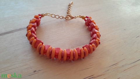 Nib-bit, o-bead és crescent üveg gyöngyökből drótra fűzött karkötő, delfinkapoccsal és lánchosszabítóval. A karkötő hossza 15cm+4cm lánchosszabító.