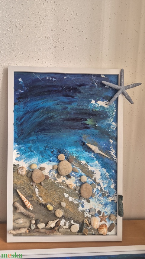 A kép peble technikaval készült, az akril festéken kívül kavicsokat, tengeri homokot és apró sódert, kagylókat és csigahazakat használtam, melyek nagy része valóban a tengetpartrol származik. Az esztétikai hatás miatt vma kép 90%-a készült természetes anyagok felhasználásával. Mérete 40x60-as.