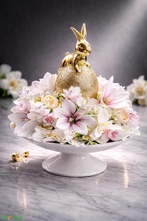 A gondosan válogatott művirágok (fehér, rózsaszín és krém árnyalatokban) finom, tavaszias hangulatot teremtenek, míg a csillogó arany tojás és nyuszi exkluzív megjelenést kölcsönöz az alkotásnak.