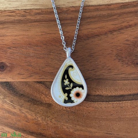Mentett angol porcelán darabok - virágos nyaklánc - csepp medál nemesacél lánccal