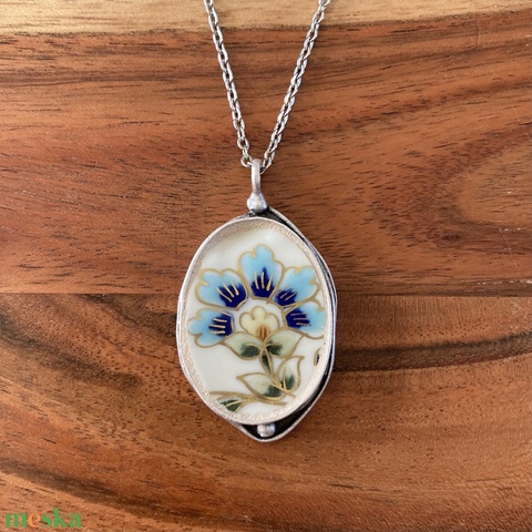 Mentett porcelán darabok - virágos medálos nyaklánc nemesacél lánccal