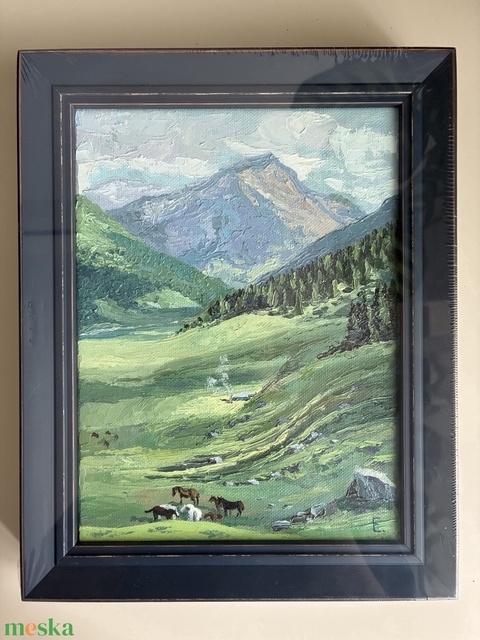 Kézzel készített olajfestmény, amelyen egy nyugalmat árasztó alpesi legelő látható legelésző lovakkal. Késes technickával készített olajfestmény. 18 x 24 cm-es feszített vásznon keretezve, keretezett mérete 23 x 29 x 3,5 cm. Kérlek vedd figyelembe, hogy a kép elött plexi/ üveg. Alkalmas műkedvelőknek ajándékba vagy akár saját magadat is meglepheted vele.