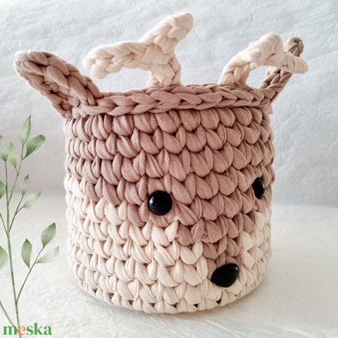 Horgolt szarvas tárolókosár egyedi felirattal. Ajándék gyerekeknek