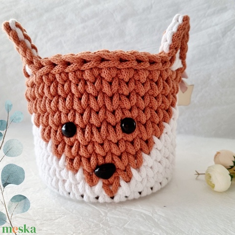 Horgolt róka tárolókosár egyedi felirattal. Ajándék gyerekeknek