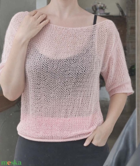 Kézzel kötött kasmír pulóver – púderrózsaszín, áttetsző, nőies fazonú elegáns női pulóver XS méret