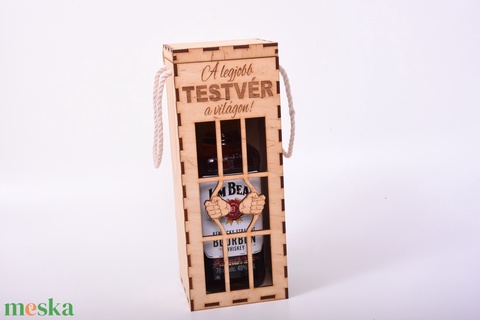 Egyedi és vicces díszdobozt keresel egy italnak? Megtaláltad. 🙂 A képeken látható „borbörtön” biztosan nagy sikert arat! A tartó teteje nyitható, oldalról fonott kötél fülek találhatók rajt a kényelmes szállításhoz. A gravírozást az általad kért saját szöveggel is kérheted. Ez az egyedi, fából készült, gravírozott italtartó stílusos és praktikus kiegészítő minden ital kedvelő számára. A természetes faanyag meleg árnyalatai és a részletgazdag gravírozás elegáns megjelenést kölcsönöznek neki. Tartóssága és egyedi kialakítása tökéletesen alkalmassá teszi italok tárolására vagy ajándékként is.