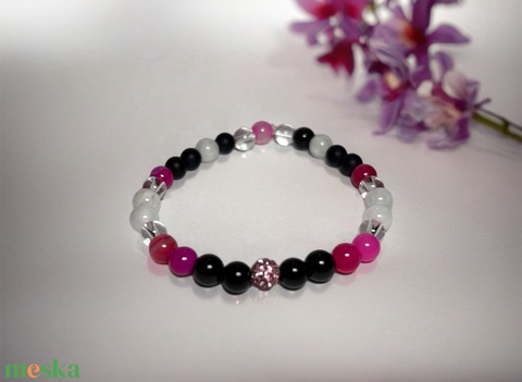 Theta ásványkarkötő - biztonság - hegyikristály, apacsszem obszidián, ónix, pink achát, holdkő