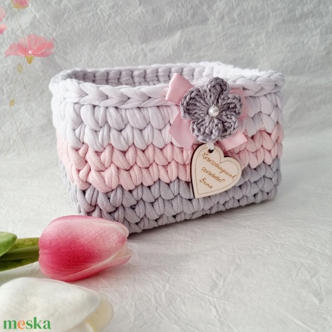 Horgolt tárolókosár egyedi felirattal. Ajándék anyák napjára