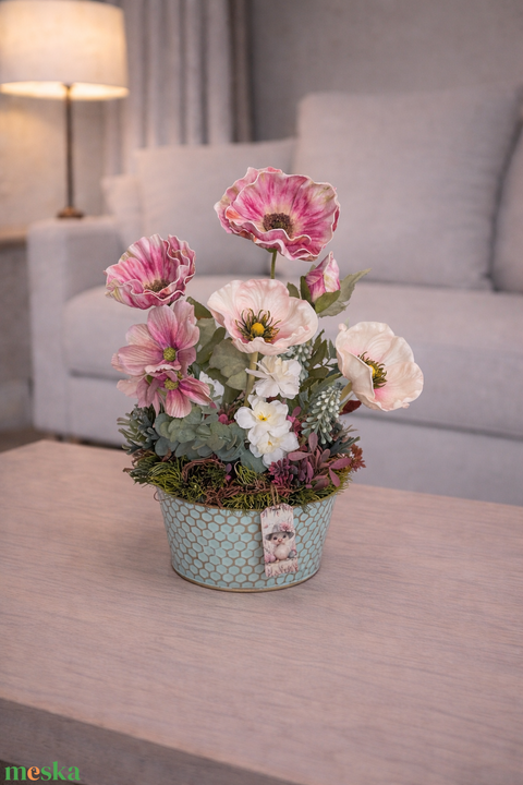 - Anyag/Összetevő zöldlevelek, kaspó, pipacs, pillangóvirag, dekortábla