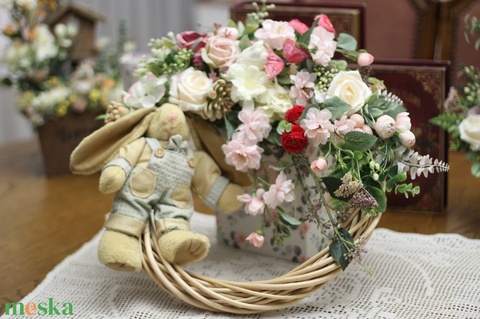 - Anyag/Összetevő vessző alap, minőségi selyem virág, nyuszi figura