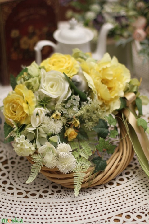 - Anyag/Összetevő fonott vessző alap, minőségi selyem virág, porcelán madár