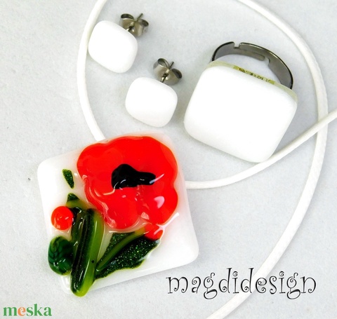 Pipacsok üvegékszer szett nyaklánc, gyűrű, stiftes fülbevló