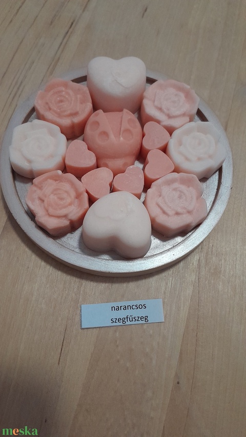 Szójaviaszból készült illatviaszok barack színben, narancsos szegfűszeg illattal. Gipszből öntött 11 cm átmérőjű tálkán.