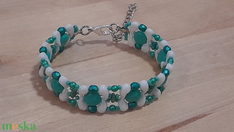 Cseh gyöngyökből, kétlyukú gyöngyökből drótra fűzött karkötő, delfinkapoccsal és hosszabbító lánccal. A karkötő hossza 18cm+4cm.