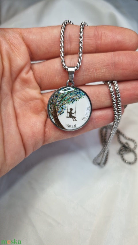 A medálban gyermeked/szeretted hajtincséből készítek oldalt növő fa mintát hintázó gyerek motivummal– az élet, a szeretet és az összetartozás jelképét.