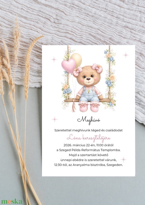 Lányos keresztelési meghívó, álomszép, pasztell, hintás macis grafikával – Prémium Megjelenés