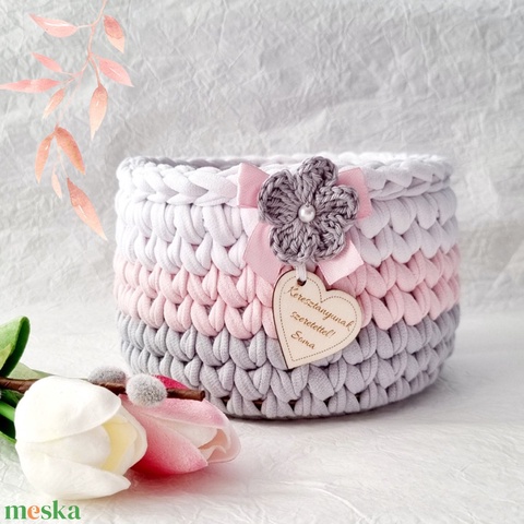 Horgolt tárolókosár egyedi felirattal. Ajándék anyák napjára