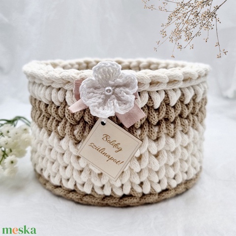 Horgolt tárolókosár egyedi felirattal. Ajándék anyák napjára