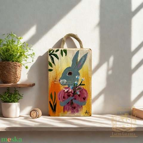 Virággyűjtő nyuszi - Rusztikus Fatábla, Gyerekszoba, Egyedi Falidísz, Húsvét, Virág, Nyúl, Nyuszi, Falikép