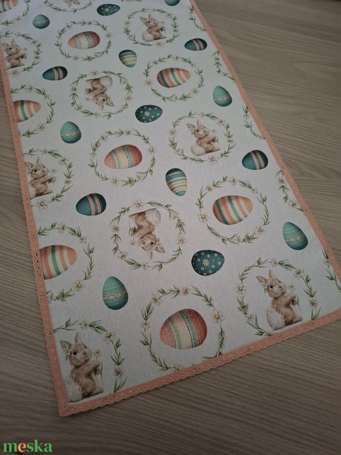 Húsvéti asztali futó terítő - nyuszkós, fehér, pasztelles színvilágban