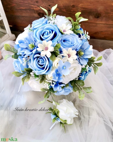 Valami kék Menyasszonyi csokor, örökcsokor, selyemvirág csokor kitűzővel,