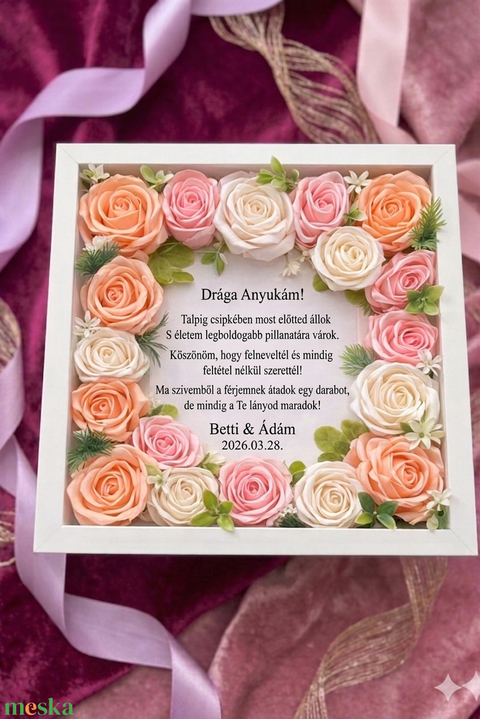 Szatén rózsával díszített kép szülőköszöntő ajándéknak