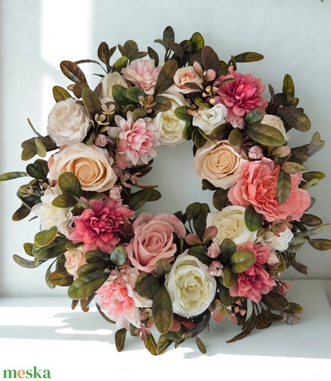 Virágos elegáns koszorú – virágos ajtódekoráció, romantikus színvilág - nagyméretű