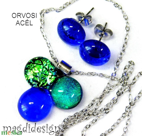 Zöld-türkiz-kék dichroic bogyós színtrió üvegékszer szett nyaklánc stiftes fülbevaló
