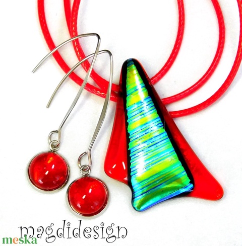 Tüzes türkiz-zöld csíkos szögek üvegékszer szett nyaklánc lógós fülbevaló