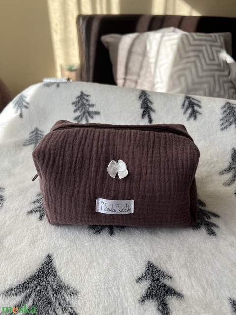 'Hazel' Beauty Case pamut neszesszer masnival és barna-fehér csíkos béléssel