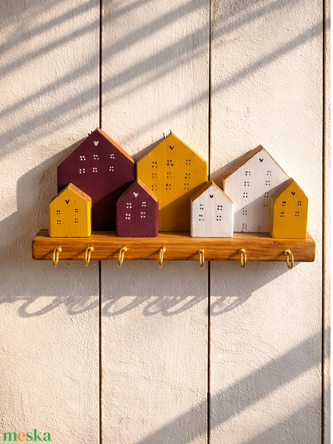 Fali kulcstartó okker, fehér, bordó házikókkal