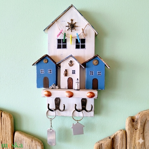 Tengerparti stílusú fa kulcstartó-dekoratív házikós falidísz