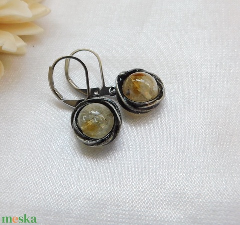 A fülbevaló tiffany technikával készült citrin és ólommentes, ezüsttartalmú ón felhasználásával. A díszítés szintén saját készítésű, nem tartalmaz gyári elemeket. A díszítés szintén saját készítésű, nem tartalmaz gyári elemeket.A fémrészt óezüstre patináztam és lelakkoztam, hogy sokáig szép maradjon.