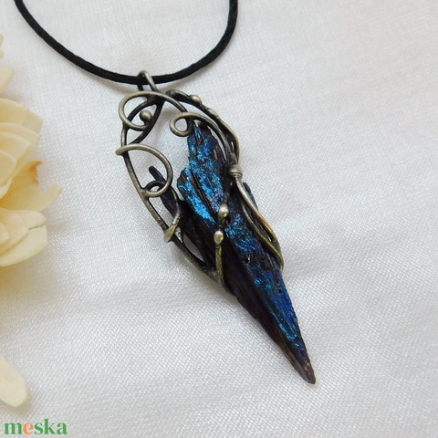 A medál Tiffany technikával készült galvanizált fekete kianit (disztén) és ólommentes, ezüsttartalmú ón felhasználásával. A díszítés szintén saját készítésű, nem tartalmaz gyári elemeket. A fémrészt óezüstre patináztam és lelakkoztam, hogy sokáig szép maradjon.
