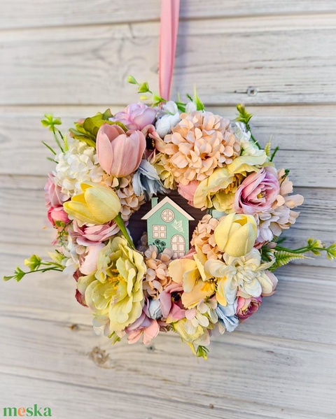 - Anyag/Összetevő selyemvirágok, fa házikó