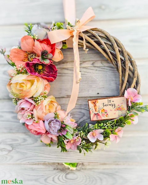- Anyag/Összetevő vessző koszorúalap, selyemvirágok, fa táblácska