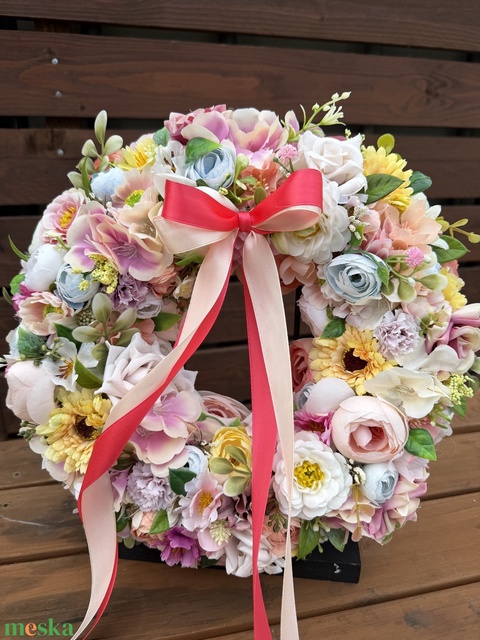 - Anyag/Összetevő művirág, szalag, koszorúalap