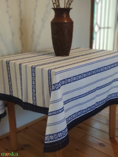 Népi mintás ünnepi terítő pamutcsipke szegéllyel - KÉK